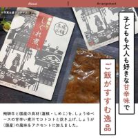 飛騨牛と国産の具材(蓮根・しめじ)を、しょうゆベースの甘辛い煮汁でコトコトと炊き上げ、しょうが(国産)の風味をアクセントに加えました。ご飯のお供はもちろん、お酒のおつまみにもどうぞ。飛騨牛が和の食卓を豊かに彩ります。